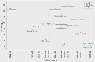 - Instead, recent models explicitly trained for reasoning show substantially smaller drops.